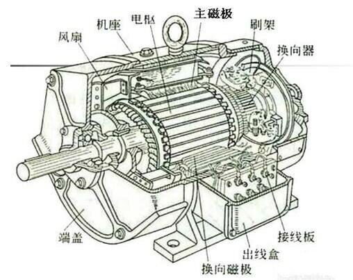 直流電機(jī)的結(jié)構(gòu)多種多樣,但原理相同。定子上總有一對(duì)直流勵(lì)磁的靜止的主磁極N和S,在旋轉(zhuǎn)部分轉(zhuǎn)子上安裝有電樞鐵芯。線圈的首和尾分別連接到兩個(gè)圓弧形的銅片上,即換向片,換向片之間是絕緣的。當(dāng)電樞轉(zhuǎn)動(dòng)時(shí),電樞線圈通過換向片和電刷與外電路接通。